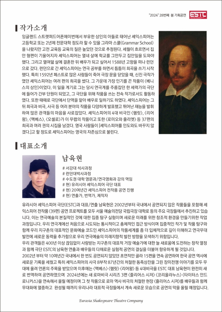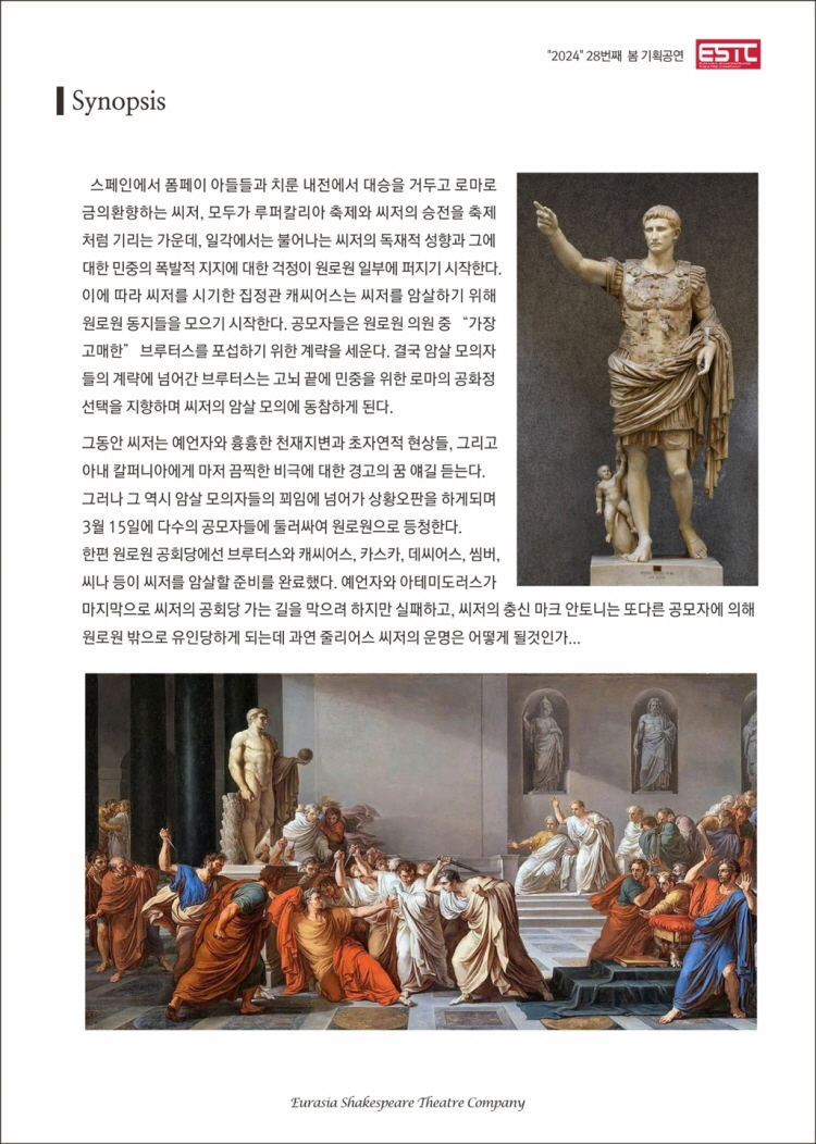 2002년 창단 공연부터 연속해서 10년 이상 국내초연작 공연들만 15편 정도를 공연해왔던 ESTC가 2024년 3월 7일 목요일부터 3월 17일 일요일까지 셰익스피어의<줄리어스 시저>를 극단 창단 22주년 새봄 시즌을 맞아 대학로 부근 (혜화역 4번출구 혜화로타리 근처) 서울 종로구 창경궁로 254 에 위치하여 접근이 쉽고 기다리는 관객을 위한 극장 로비 등 비교적 시설이 좋은 극장 한성아트홀2관에서 올리게 되었습니다